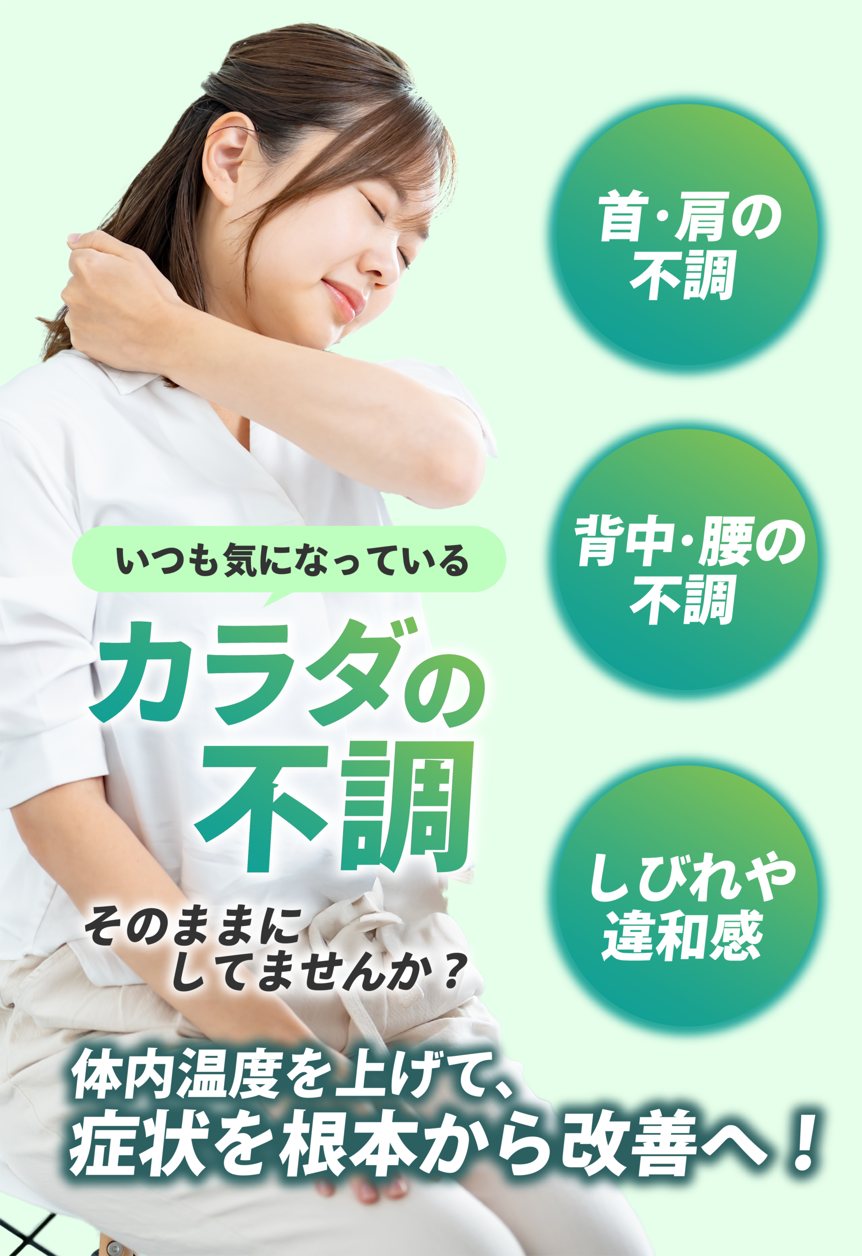 筋膜性腰痛/足底腱膜炎/外側上顆炎/捻挫/肉離れ/打撲治癒促進/足関節可動域改善/膝関節可動域改善/肩関節可動域改善/肩こり/末端の冷え/睡眠の質改善
