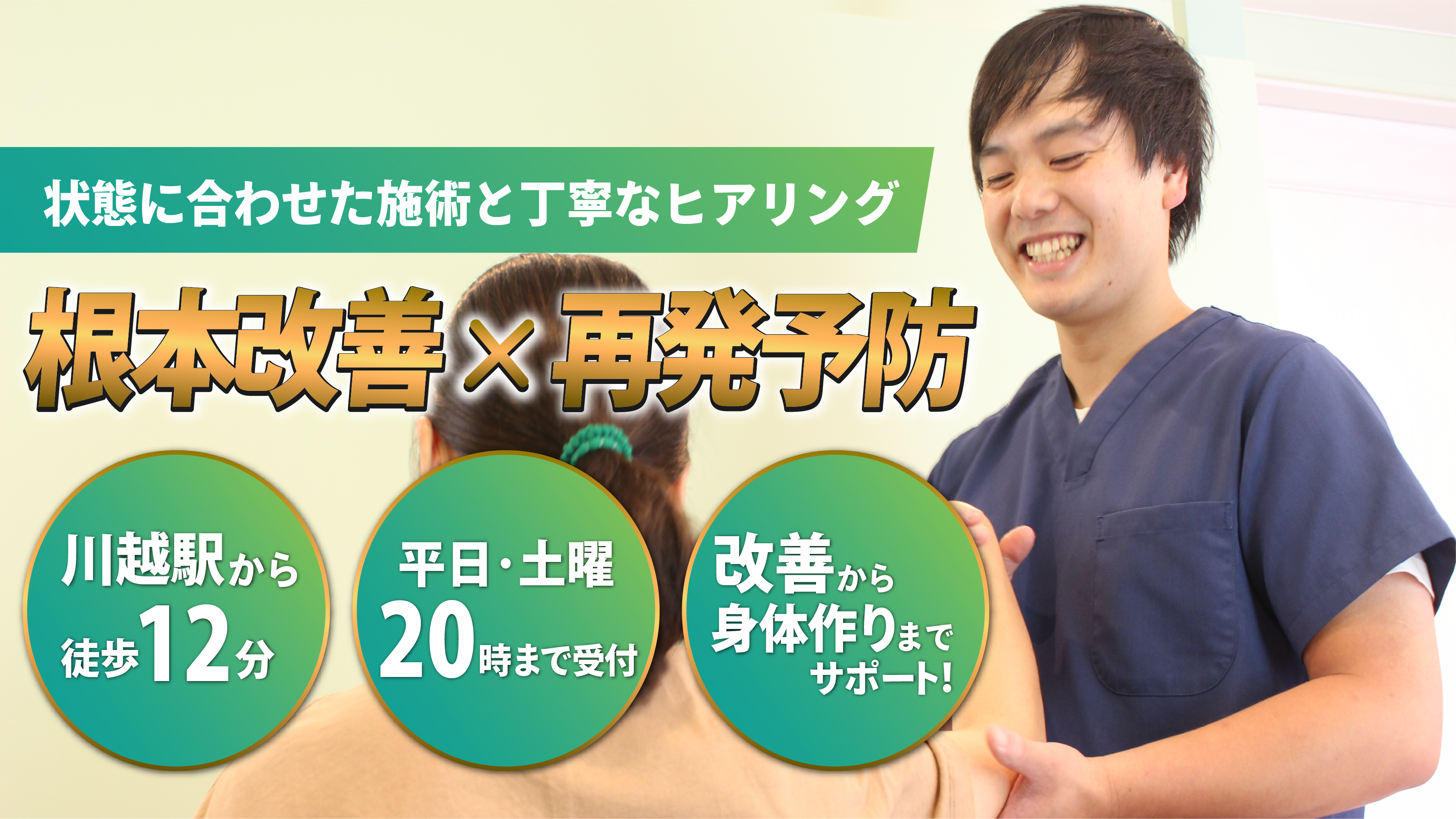 お仕事帰りでも通いやすい環境として、20時まで診療しております。川越駅から徒歩12分・駐車場2台完備しております。ご自身の生活リズムに合わせてご利用いただくことが可能です。
